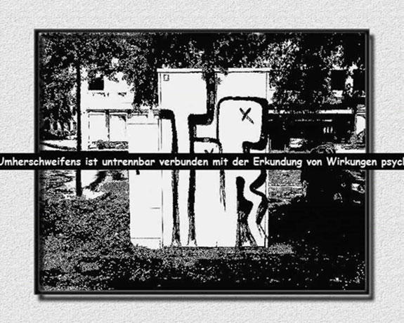 Wolf D. Schreiber DE The Great Art Swindle 3min 30sec 2009 One of the basic situationist practices is the dérive [literally: "drifting"], a technique of rapid passage through varied ambiances. Dérives involve playful-constructive behavior and awareness of psychogeographical effects. |