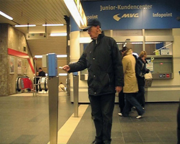 Anja Abele DE Institut Orange: Die Geh Dreh Schau Bewegung 00min 31sec 2009 Anja Abele DE Institut Orange: Das Ticket Stempeln 00min 56sec 2010 Institut Orange ist ein künstlerisches Label, das Körperbewegungen im urbanen Raum untersucht und speziell solche Bewegungsmuster dokumentiert und archiviert, die aufgrund ihres speziellen Vorkommens Orte prägen und einen entscheidenden Anteil an der Vielfalt eines Stadtbildes tragen. |