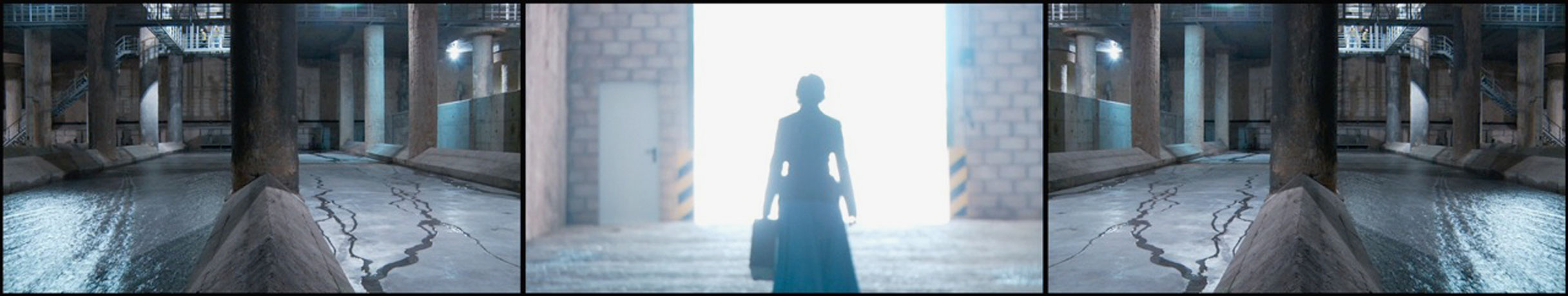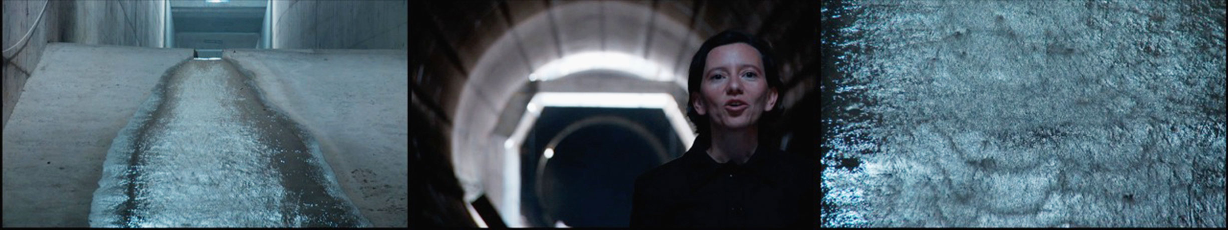 Tom Skipp ES Stormwater / Estanque de tormentas 14min 23sec 2009 The piece, a three screen video installation, explores a lesser known urban space to be found at the heart of our cities: stormwater reservoirs. Filmed inside the biggest stormwater reservoir in Europe just before it was opened, filled with water and closed to the public forever. A female singer metaphorically takes on the role of stormwater, thus reflecting the monumental, timeless man made architecture built to handle the might that nature still has on cities. |