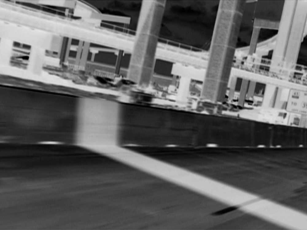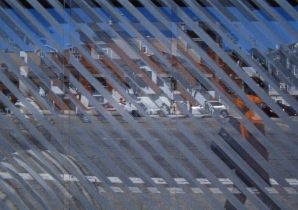 Chris Kennedy CA Simultaneous Contrast 5 min 00 sec 2008 16mm screening The striped pattern of the municipal bus shelters in San Francisco becomes a fixed foreground behind which the city passes. Spatial oscillations provide a constantly permutating play of figure, ground and space, imaging the possibility of being two places at once. |