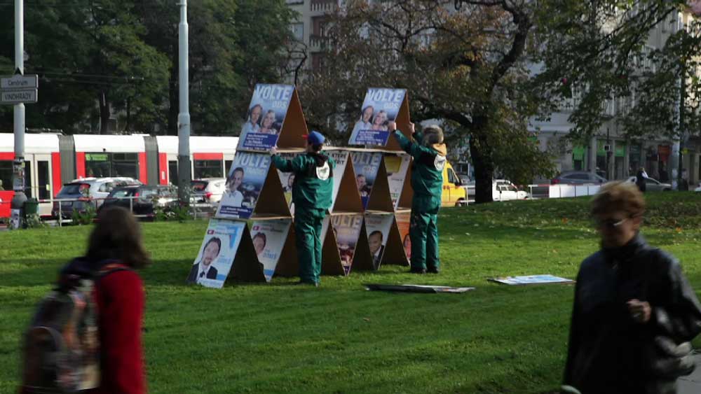 Vladimir Turner CZ Dum Z Karet / House of Cards 2 min 36 sec 2011 German Premiere Two pyramides made of stolen political ads. I took all the propaganda around this particular park, in the centre of Prague. I cleaned out this area from political propaganda, which used guerilla advertising methods. One of the objects fell down by wind, the other was teared down by city cleaners. |